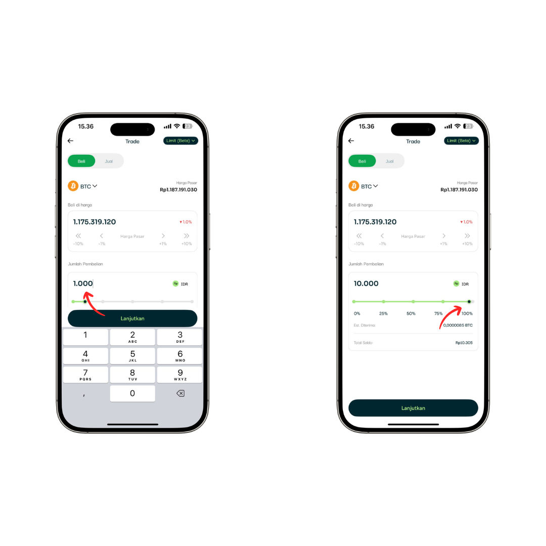 6. Masukkan Jumlah Aset, Tentukan jumlah koin atau nominal Rupiah yang ingin kamu transaksikan. Biar lebih cepat, kamu juga bisa geser slider persentase saldo (misalnya 25%, 50%, atau 100%).